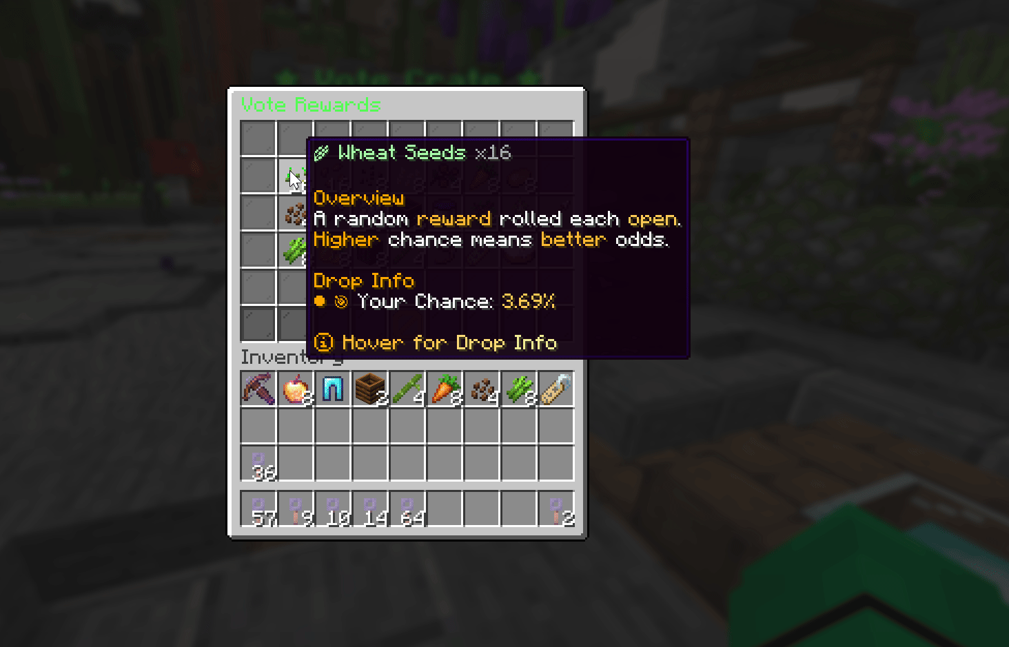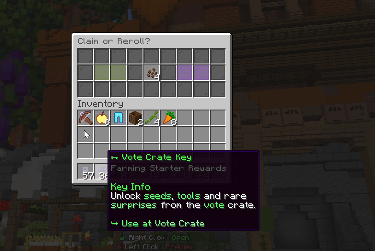 ๐ฆ Crate Tiers๐ข Vote Crate - Seeds, farming supplies, iron tools, bonus diamonds & a rare Mending book