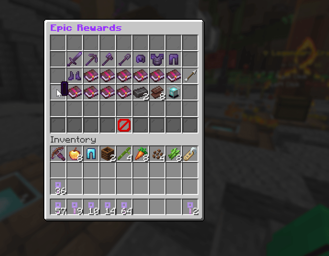 ๐ข Vote Crate ![]() Physical Vote Crate with green circle particles, end rod glow & hologram display. ![]() Rewards preview of the Vote Crate - 37 rewards including seeds, iron tools & rare keys. ๐ก Common Crate ![]() Physical Common Crate with lime circle particles, flames & soul fire glow. ![]() Rewards preview of the Common Crate - 40 rewards including enchanted iron gear & diamond drops. ๐ต Rare Crate ![]() Physical Rare Crate with cyan diamond particles, enchant glyphs & soul fire spiral. ![]() Rewards preview of the Rare Crate - 38 rewards including 15 enchant books & full diamond gear. ๐ฃ Epic Crate ![]() Physical Epic Crate with purple ninja star particles, portal spiral & spell aura. ![]() Rewards preview of the Epic Crate - 34 rewards including full netherite gear & elytra. ๐ Legendary Crate ![]() Physical Legendary Crate with gold quatrefoil particles, flame tornado & pulse aura. ![]() Rewards preview of the Legendary Crate - 30 rewards including maxed god gear & dragon egg. ๐ Reroll Menu ![]() Accept or reroll your reward with styled claim & reroll buttons. All players get 1 free reroll. VIP gets 2, MVP gets 5, Elite gets 8. ๐ Physical Crate Keys ![]() All 5 physical crate keys with hex gradient lore and color-coded themes. |
